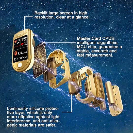 Tiworld™'s latest innovation, the multifunctional non-invasive laser glucometer, integrates cutting-edge technologies for superior health monitoring. Equipped with a low-energy smart control chip and utilizing the advanced 'LAMBERT BEER' algorithm, this device ensures highly accurate measurements. It combines photon chip technology and silicon with light absorption spectroscopy to provide reliable, non-invasive monitoring of blood glucose, blood pressure, and blood oxygen levels. Certified by Health American, the device includes six display functions for easy and comprehensive health tracking. Whether you're managing diabetes, monitoring cardiovascular health, or tracking oxygen levels, Tiworld™ offers a reliable, all-in-one solution for your health needs.